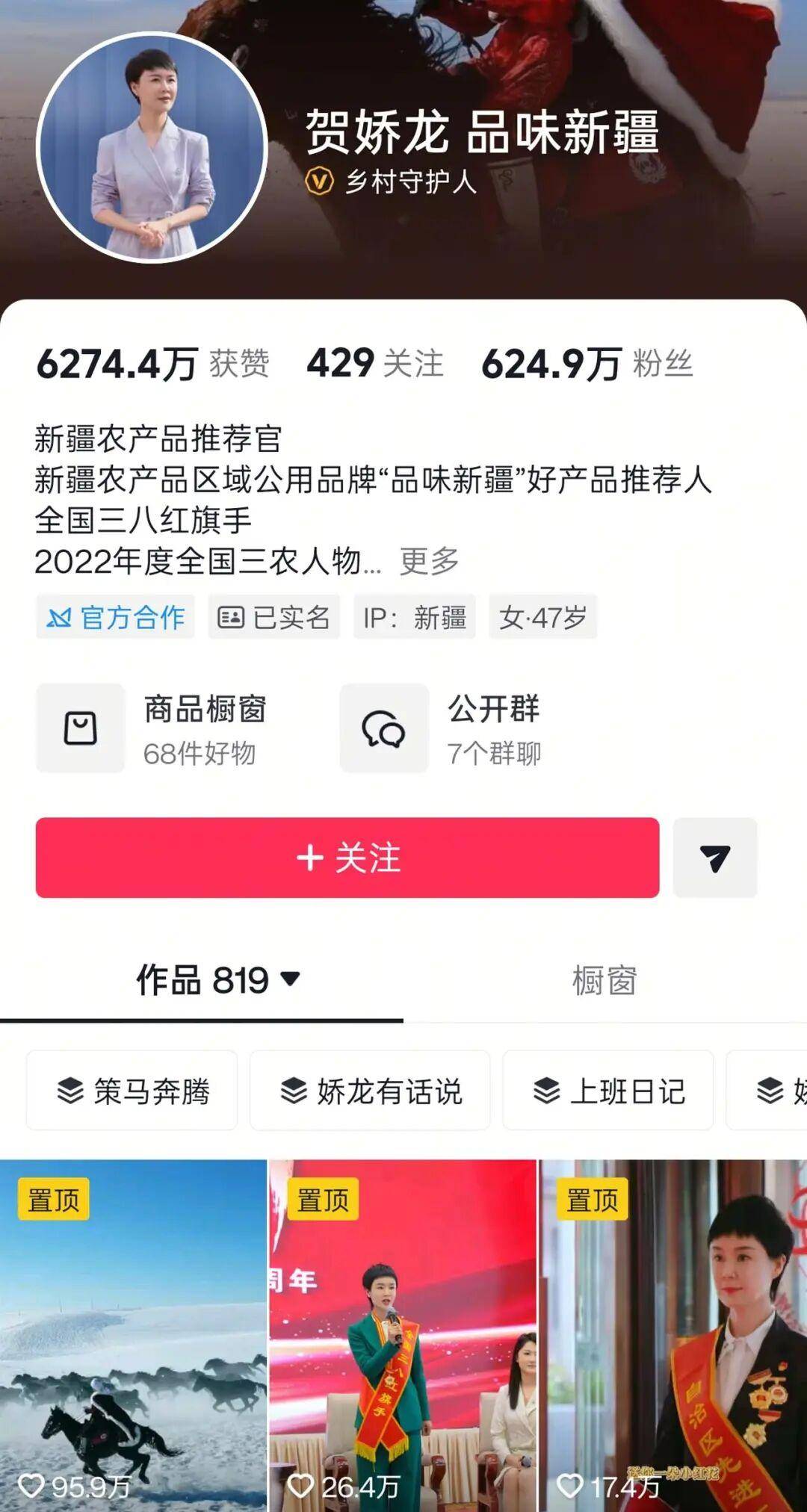极目新闻记者注意到,抖音平台上,贺娇龙的账号拥有624万多粉丝,她本人经常分享家乡的美食、风景,并直播助农带货。