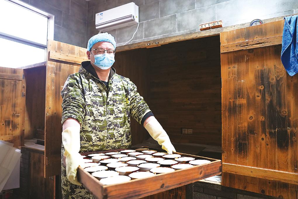 2月13日,“郭福娭毑小钵子甜酒”新的传人赵海臣从发酵间取出甜酒。新华每日电讯记者戴斌摄
