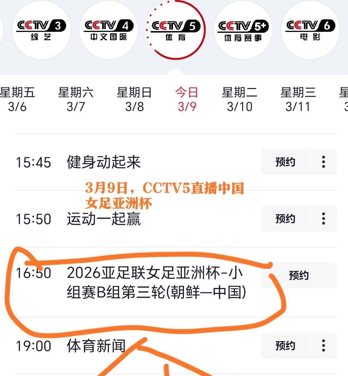 根据央视最新的节目单安排,CCTV5在3月9日下午的直播计划已经明确。 除了在16点50分开始直播这场女足亚洲杯小组赛,当晚后续的节目还包括《体育新闻》和《天下足球》等常规栏目。 全国各地的球迷可以根据自己的时间,选择通过电视或网络平台,准时收看这场决定中国女足本届亚洲杯征程走向的关键战役。