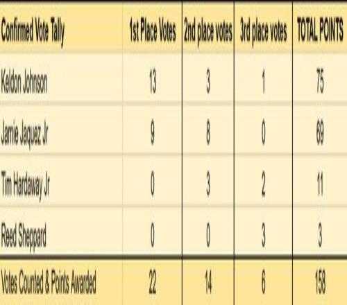 最佳第六人的竞争,预计会在凯尔登-约翰逊和小海梅-哈克斯之间进行。目前已公布的22人投票中,约翰逊拿到13张第一选票,哈克斯拿到9张第一选票,两人的票数折算分差只有6分。