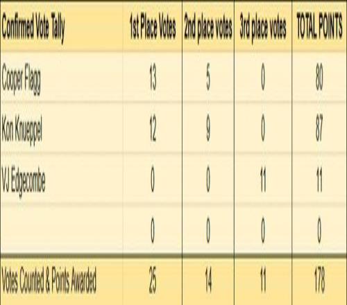 年度最佳新秀的争夺很激烈,埃奇库姆重在参与,主要争夺在弗拉格和克努佩尔之间进行。已经揭晓的25位投票者,13张第一选票属于弗拉格,12张第一选票属于克努佩尔,但票数转换成积分却是克努佩尔87-80暂时领先,因为他得到了更多的第二选票。