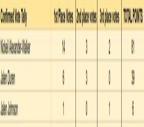 进步最快球员,目前占据优势的是亚历山大-沃克。已公布的21人投票中,有14人把他放在第一选票的位置上,领先杜伦的优势比较明显。