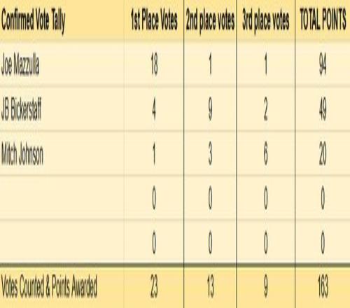 至于最佳教练,马祖拉的优势明显。已经揭晓的23位投票者,马祖拉得到18张第一选票,比克斯塔夫得到4张,米奇-约翰逊得到1张。虽然比克斯塔夫已经斩获教练协会颁发的最佳教练奖,但NBA官方的最佳教练奖预计属于马祖拉。