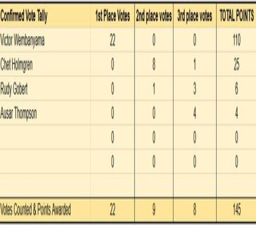 最没有悬念的应该是年度最佳防守球员。根据目前的情况,已经揭晓的22位投票者,都把最佳防守球员的第一选票投给文班亚马,认为他实至名归,文班也确实有机会全票当选最佳防守球员。本赛季常规赛,文班场均3.1盖帽1.0抢断。他在场时,对手每百回合只得106.8分,而他不在场时,对手百回合能得到116.5分。