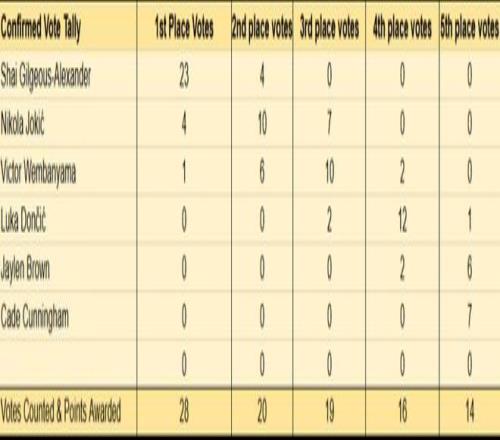 作为最重磅的奖项,常规赛MVP的归属悬念不大,已经揭晓的28位投票者,亚历山大得到23张第一选票,约基奇得到4张,文班亚马只有1张。亚历山大预计能蝉联这一奖项。