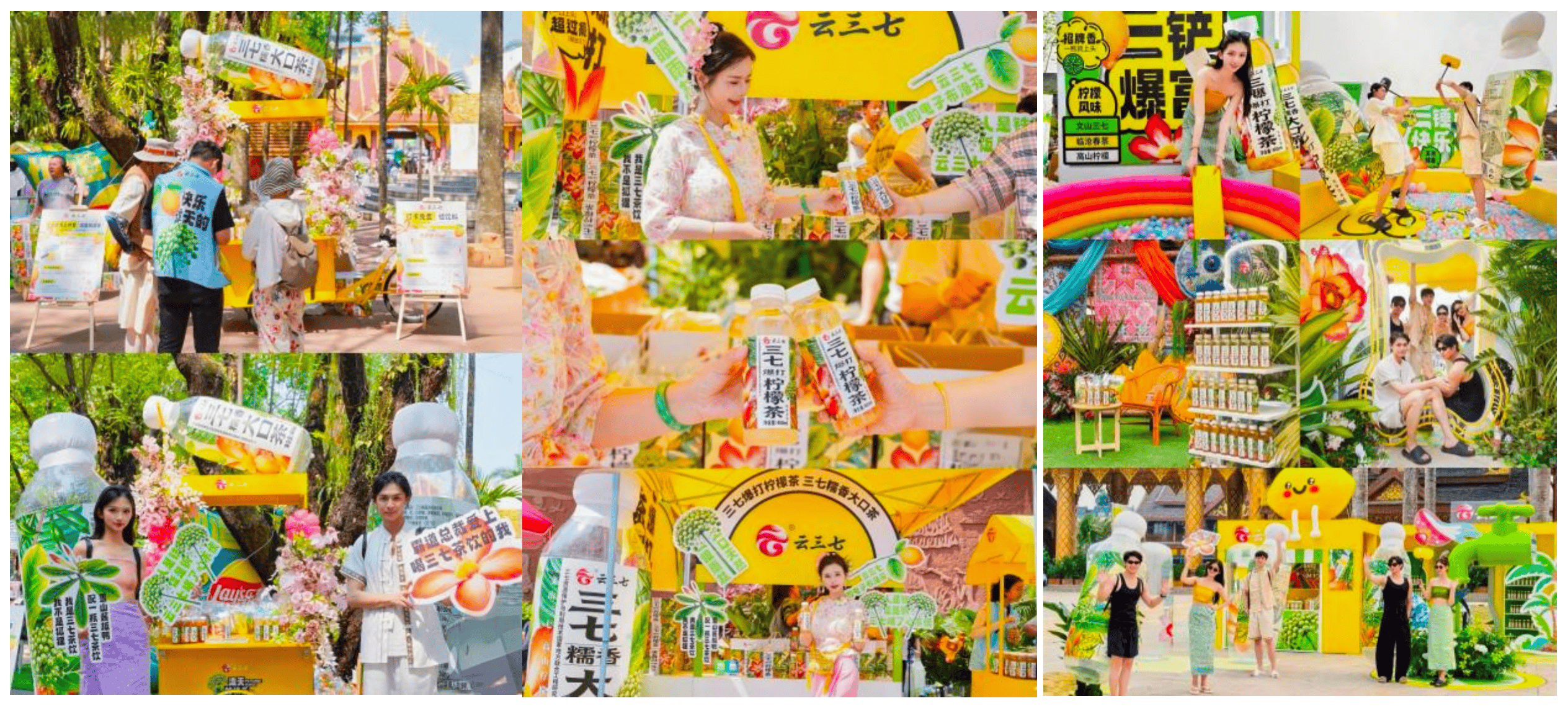 活动期间,快闪区开展打卡赠“泼水节三件套”、“水果金铲铲”、“爆打不开心”、“显眼包巡游”等趣味互动活动,邀请40余位旅行、摄影、美食类博主到场打卡传播。6天累计试饮5000+人次,出货1600件,线万,“云三七”线万,让云三七即饮茶成为游客打卡、社交分享的必备单品,成为“云南旅行必喝”的文旅符号。